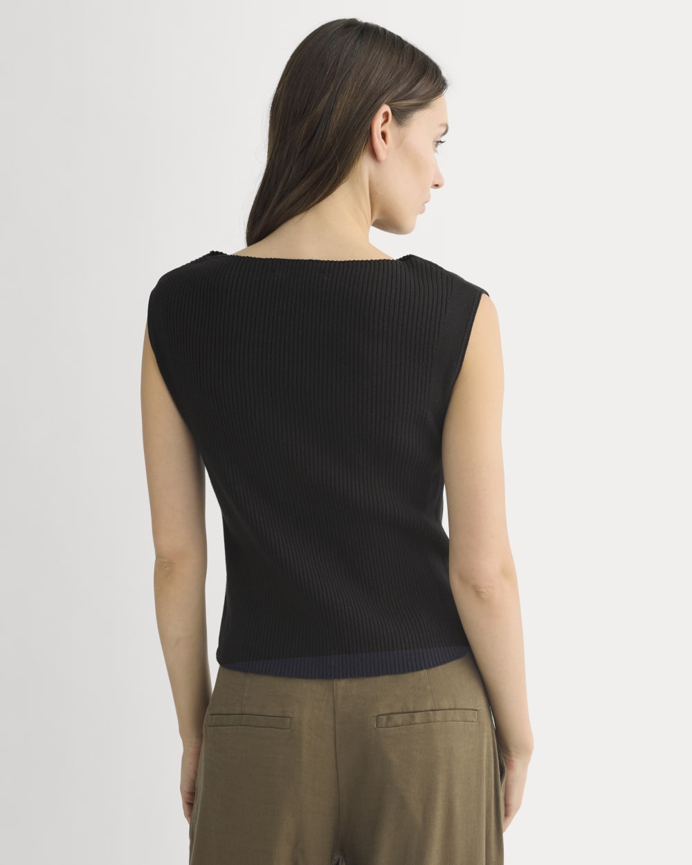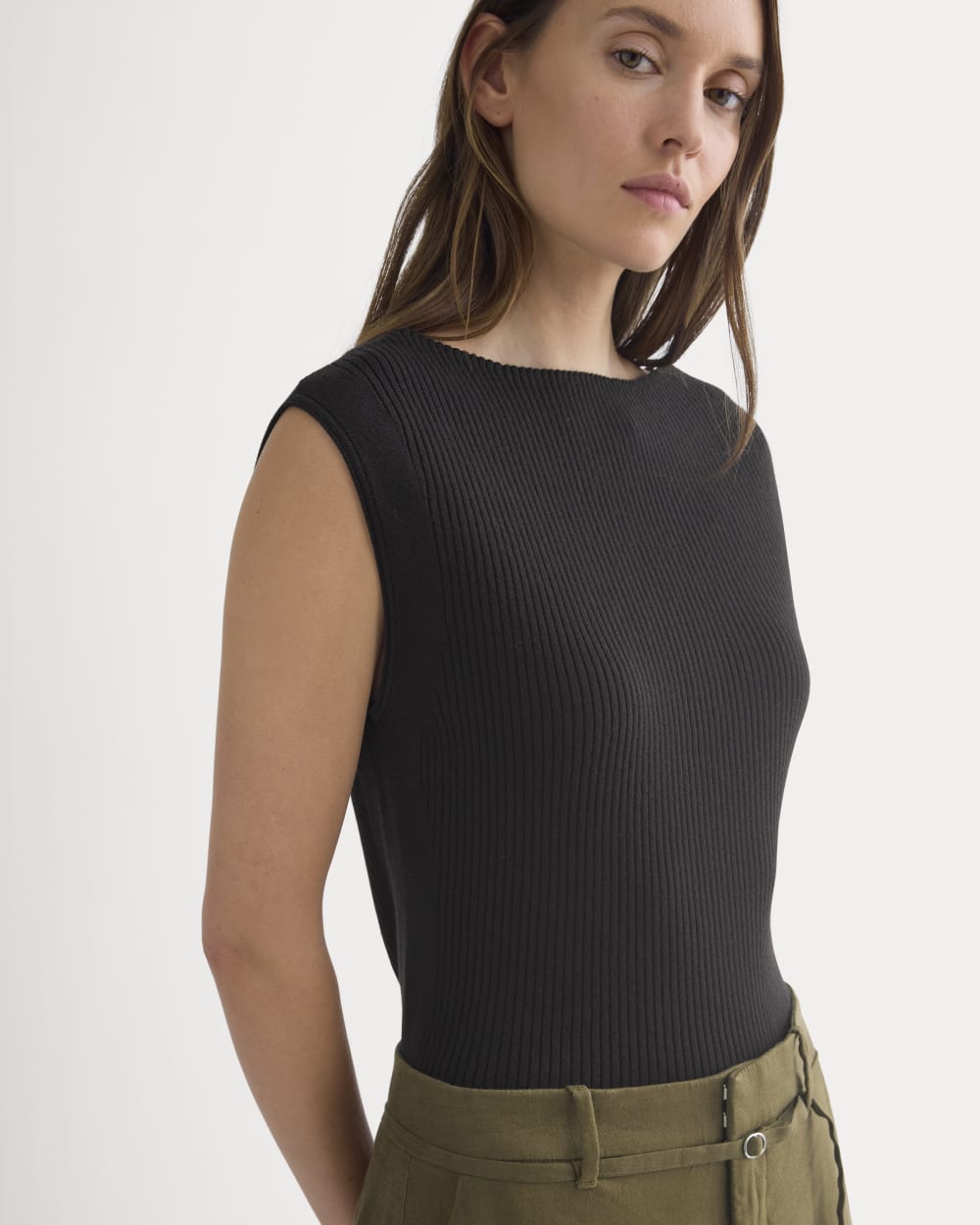 This fitted. sleeveless top has a subtle. bra-friendly boat neckline and is designed to sit cleanly on the shoulders. A structured rib on the body offers a supportive. close feel. with jersey stitch panels along the side seams. Versatile and easy to style. wear it solo or layered under a jacket or light cardigan.
