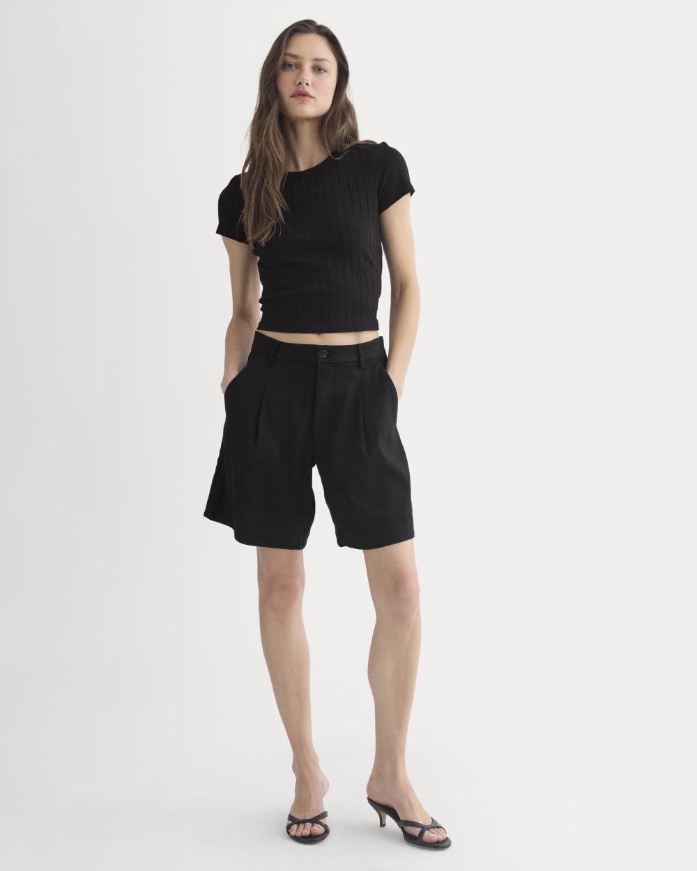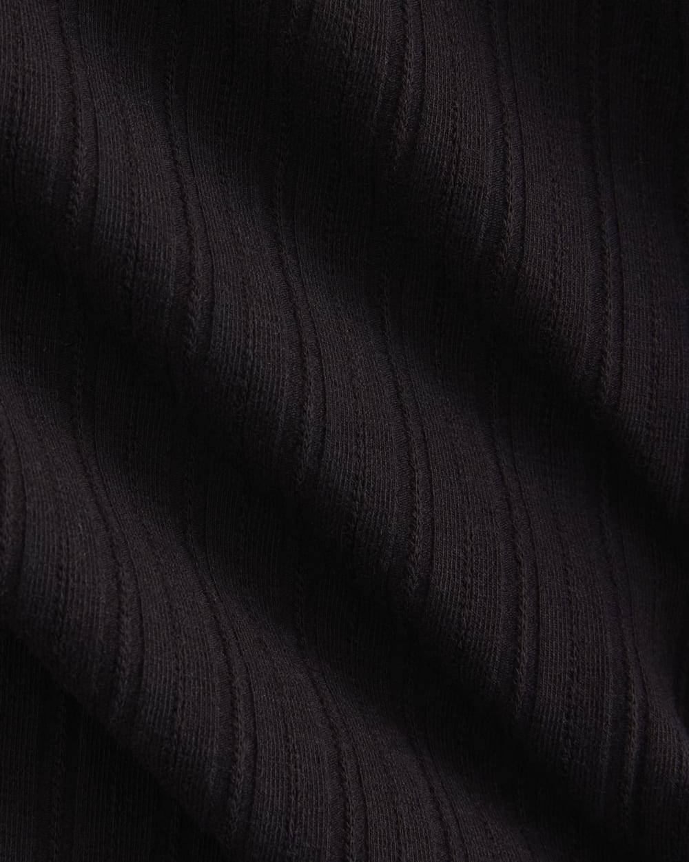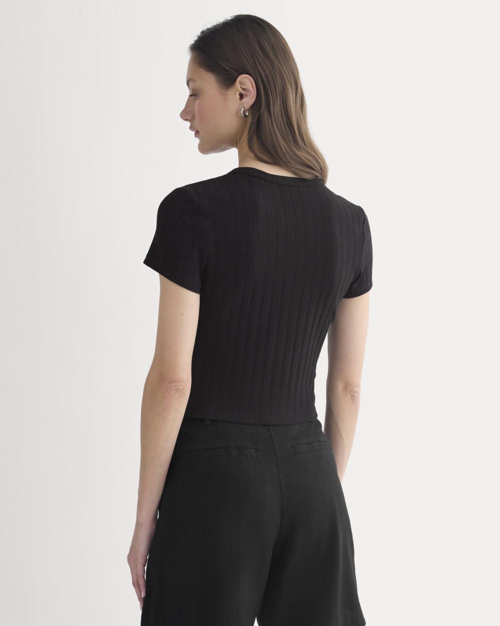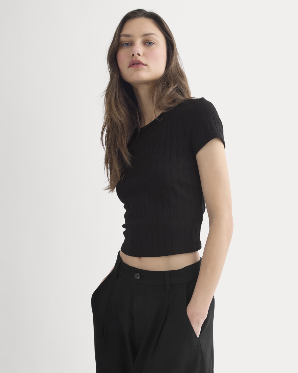 A cropped crew with a baby-tee silhouette and a close. fitted shape. Made from our pointelle fabric. it adds subtle texture and softness to an everyday essential. Wear it with relaxed denim. layered under a slouchy cardigan. or paired with tailored pants to play with proportion.