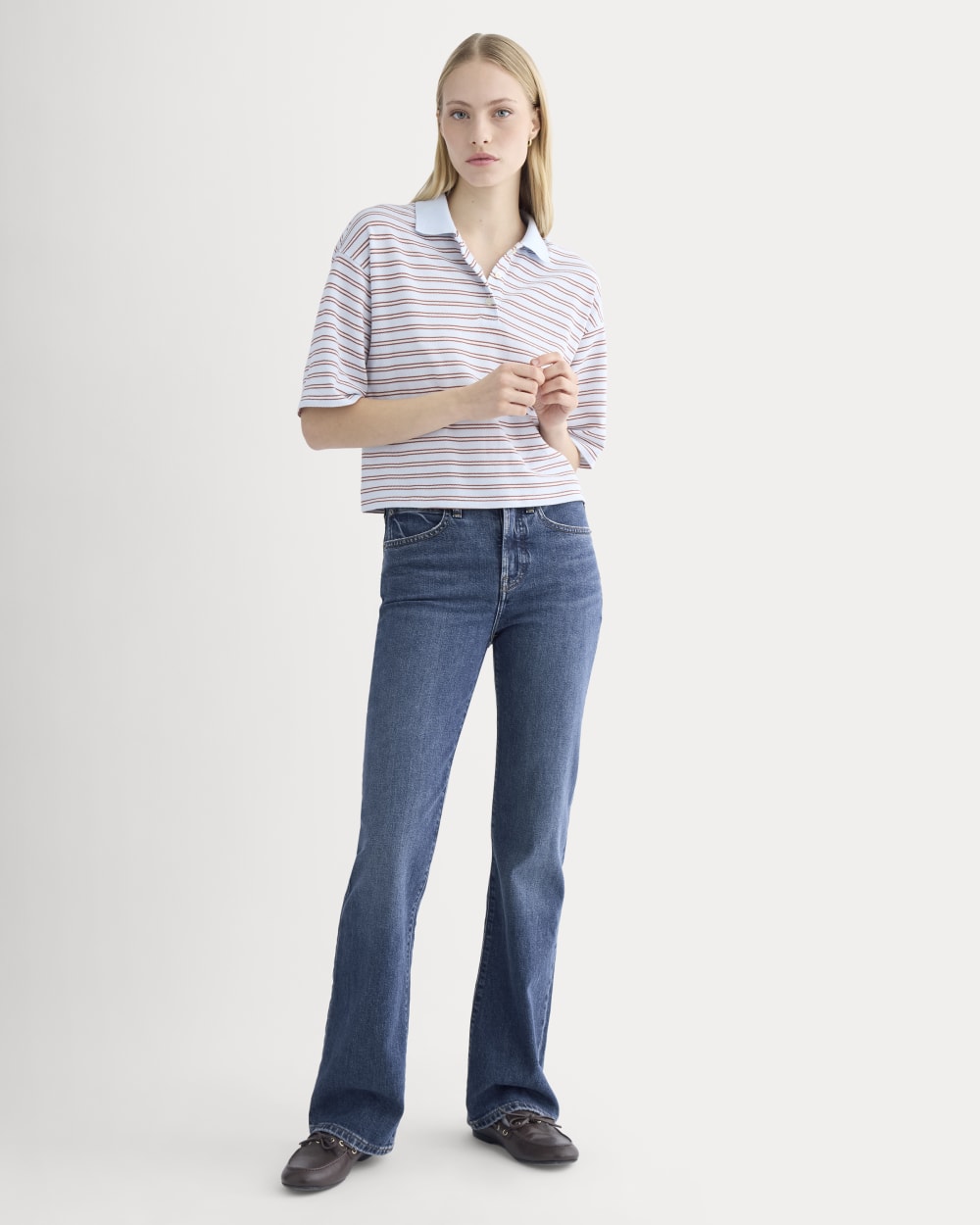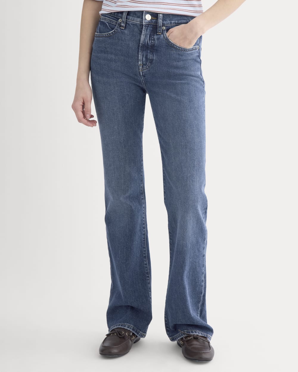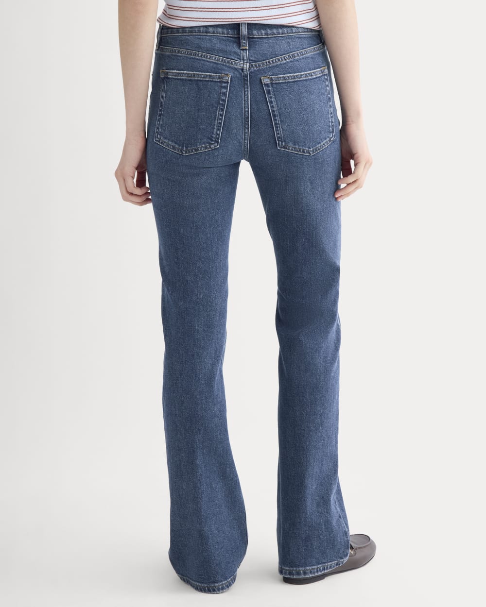 This high-rise jean fits slim through the hips and thighs. then gently flares below the knee to create a long. flattering line. Crafted from organic cotton denim with comfort stretch. Dress it up with heels or keep it casual with flats.
