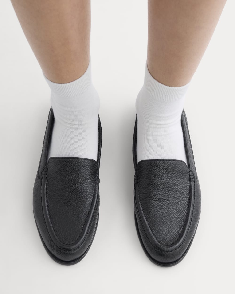 Crafted from tumbled Italian leather. this slip-on loafer features traditional moccasin stitching. a stacked heel. and a substantial feel that holds up to daily wear. Timeless. versatile. and endlessly reliable.