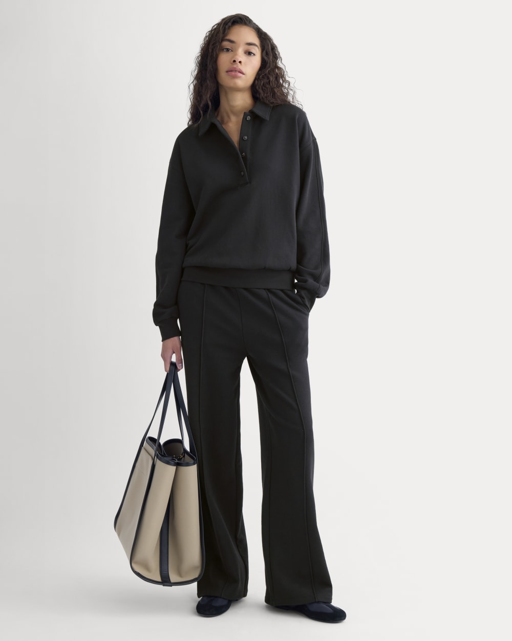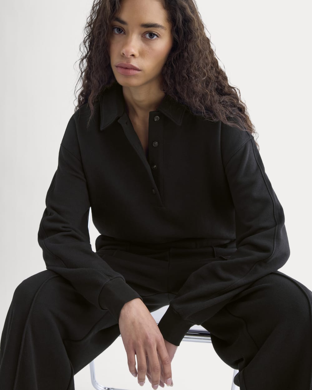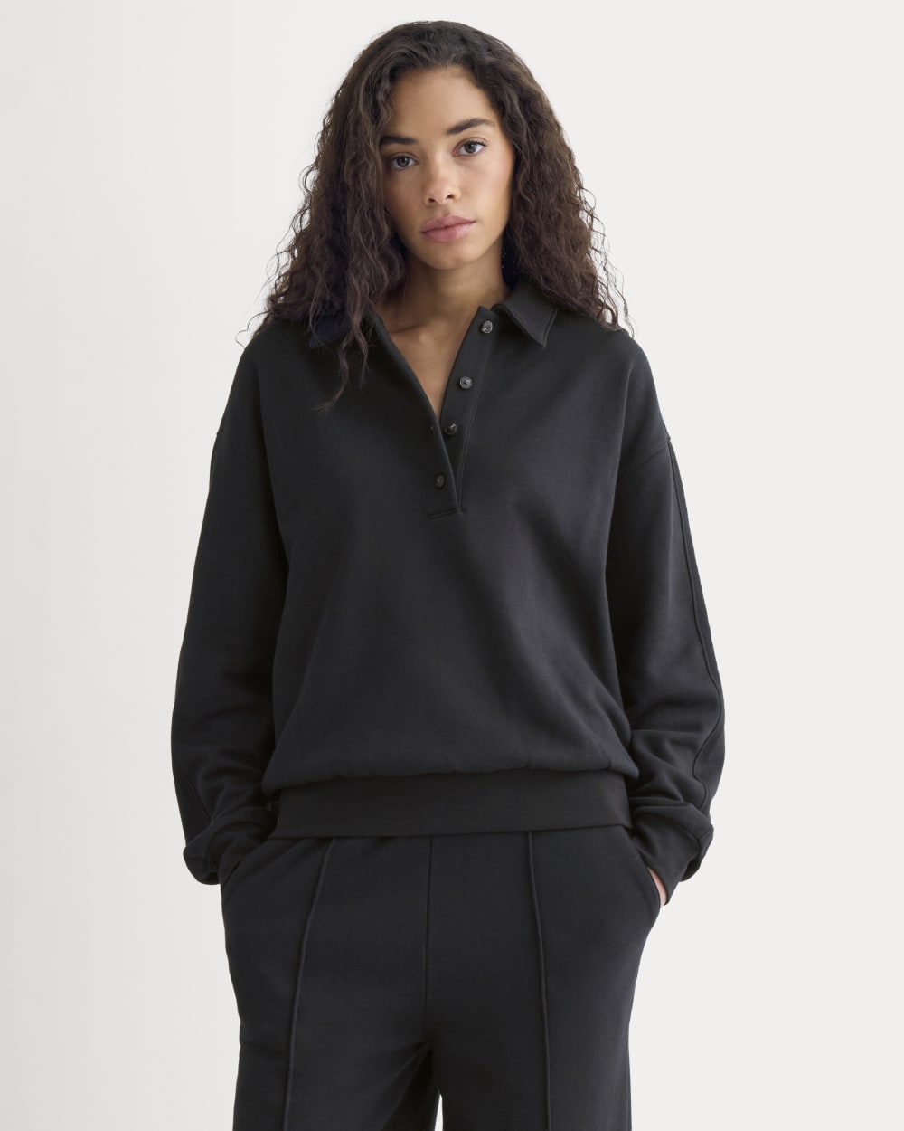 This long-sleeve polo sweatshirt has an oversized fit. soft blouson shape. and subtle seam details for a laid-back yet put-together feel. Easy. cozy. and endlessly wearable.