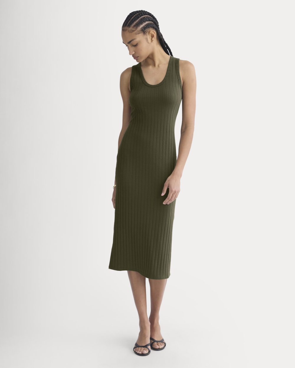 This scoop U-neckline midi dress features a close. contoured fit with a center-back seam to add shape to the silhouette. Made with our pointelle fabric for subtle texture and breathability. it's an easy warm-weather dress you'll live in all season and beyond.